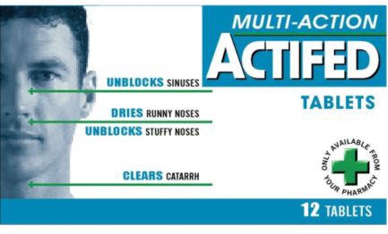 Actifed's multi-action formula contains a decongestant (pseudoephedrine) to relieve nasal congestion as well as blocked sinuses and catarrh. The anti-histamine (triprolidine) works in two ways, firstly it relieves allergy symptoms such as sneezing or hayfever, then it has a drying action so dries up a runny nose and watery eyes.